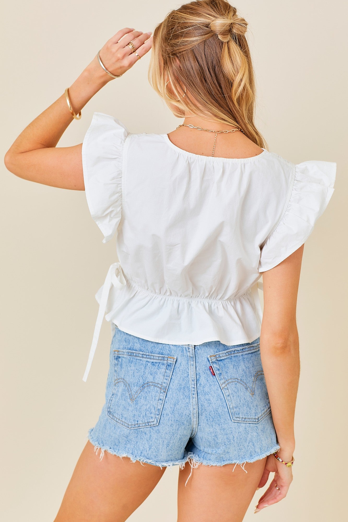 A Cropped V Neck Top With Side Ties And Ruffle Sleeves