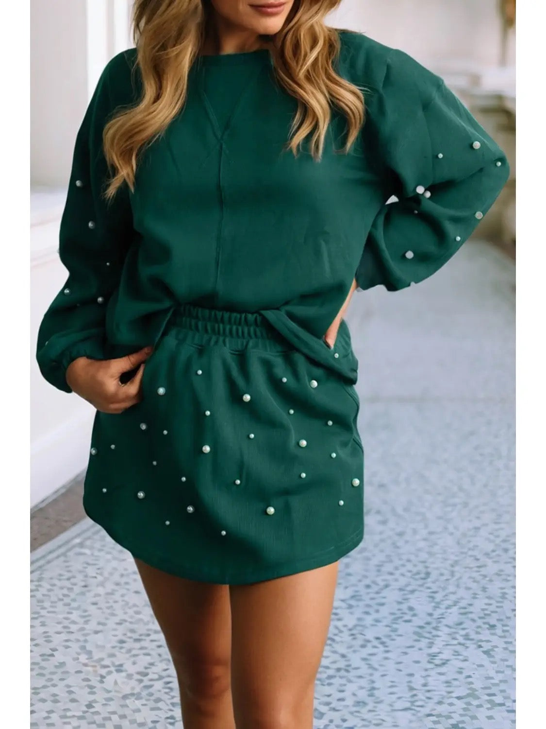 Emerald green long sleeve shirt and skirt with pearl beading