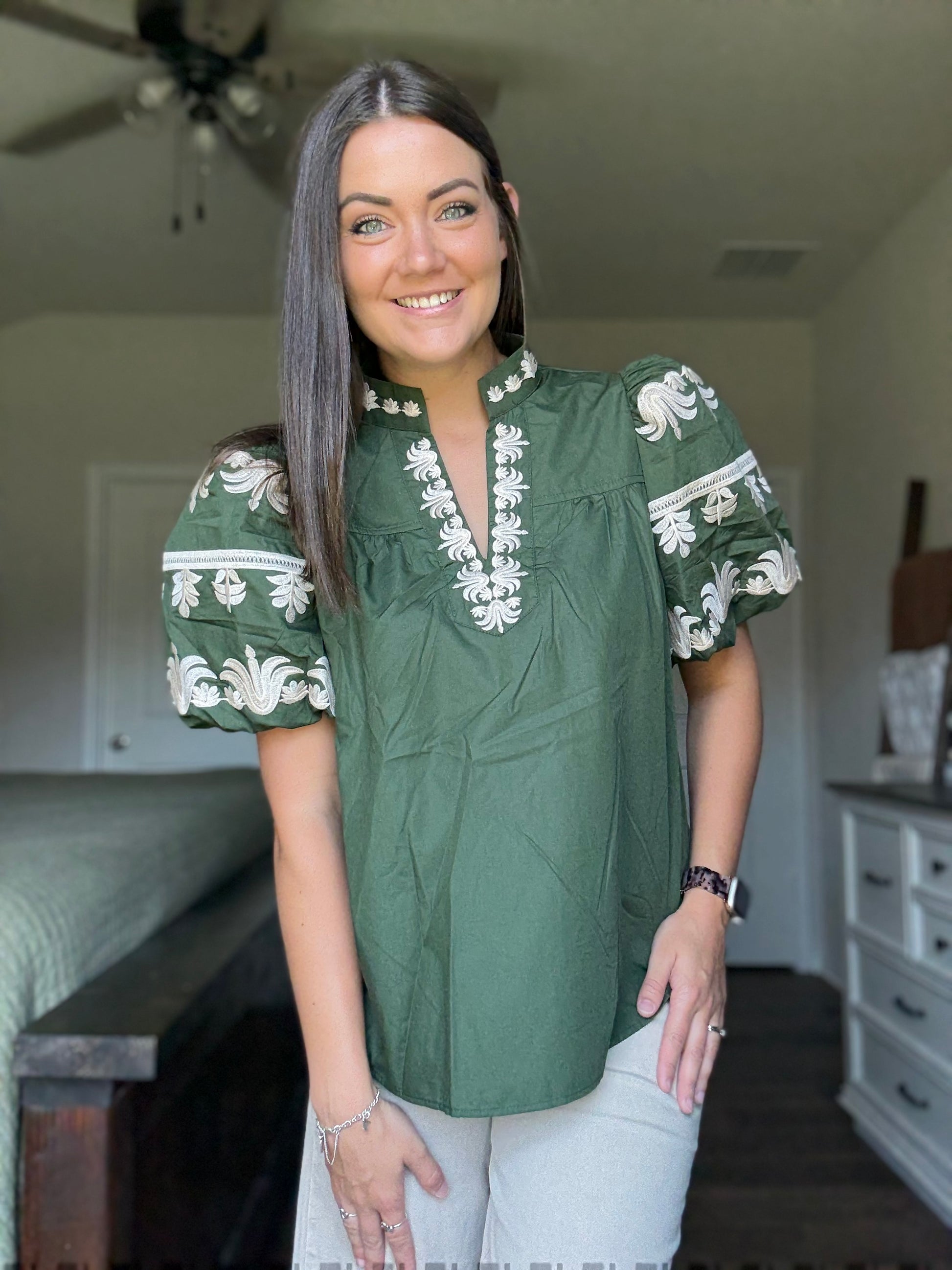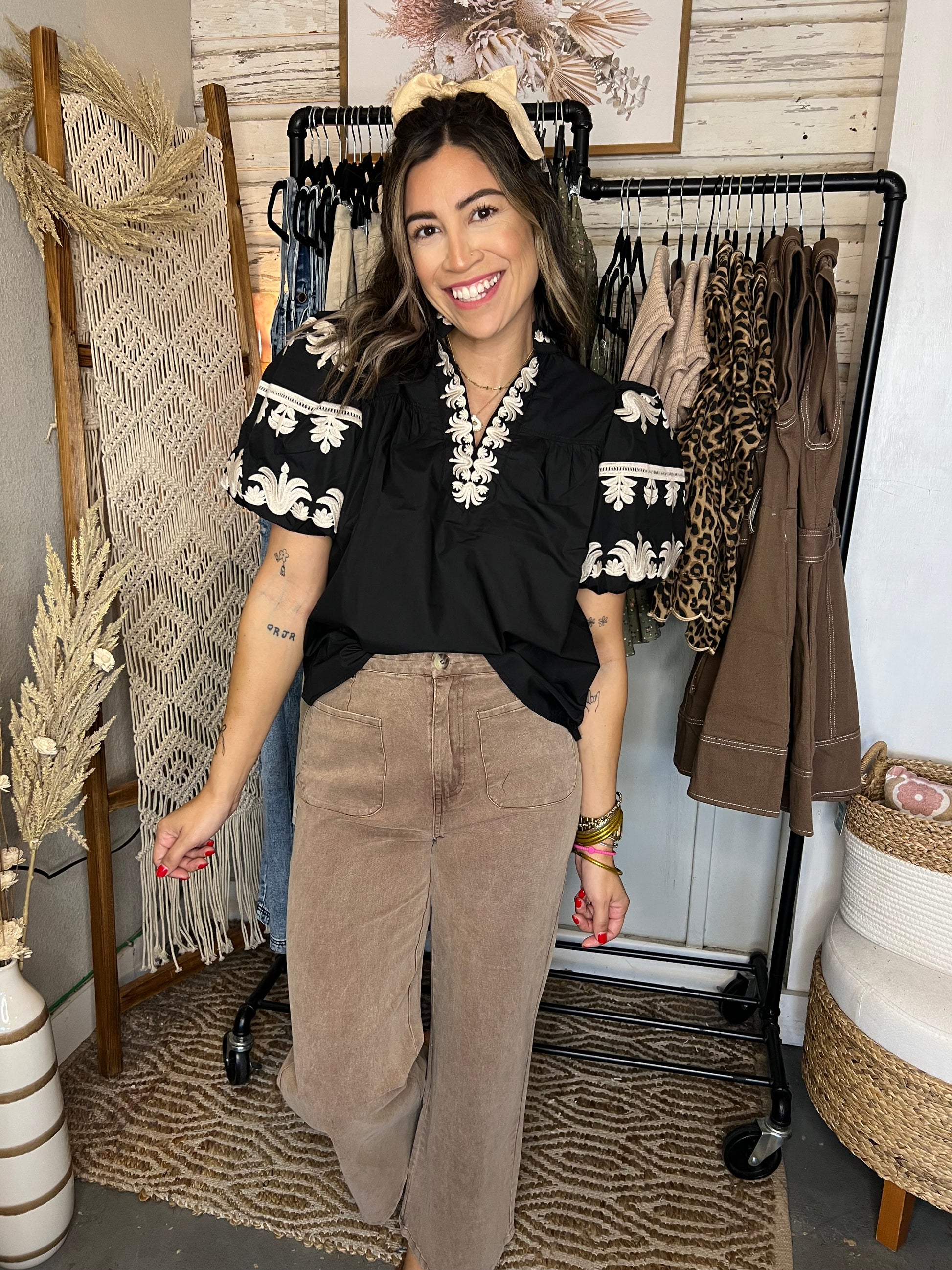 Solid V-neck band collar pullover top featuring embroidered placket and short bubble sleeve. Unlined. Woven. Non-sheer. Lightweight.