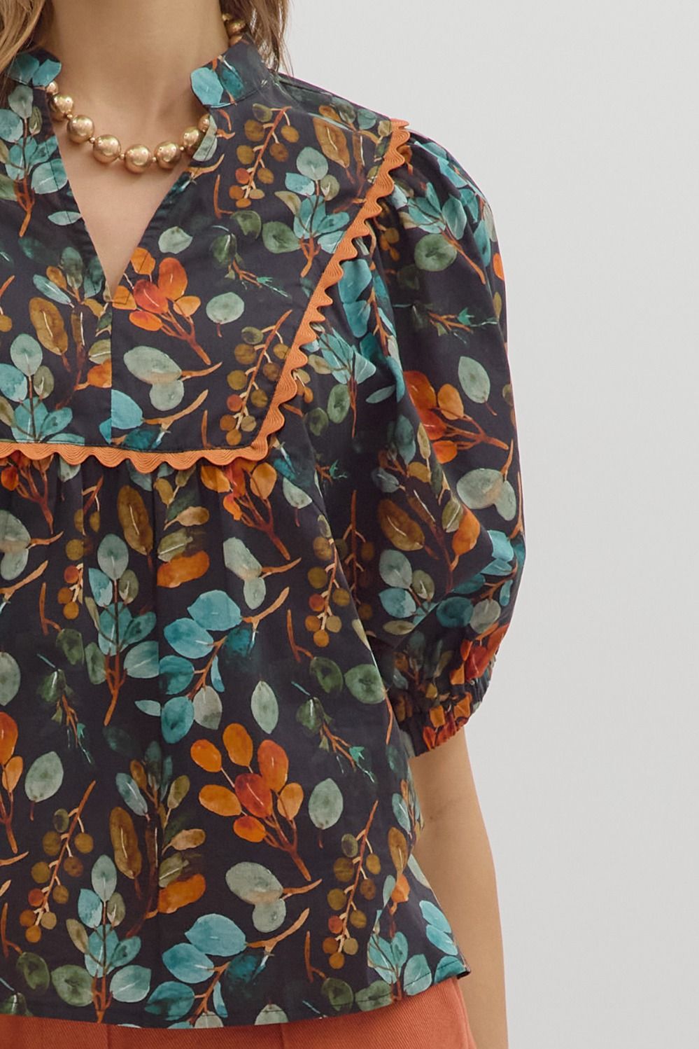 Botanical print V-neck band collar dolman sleeve top featuring contrast scallop trim inset accent. Unlined. Woven. Non-sheer. Lightweight.