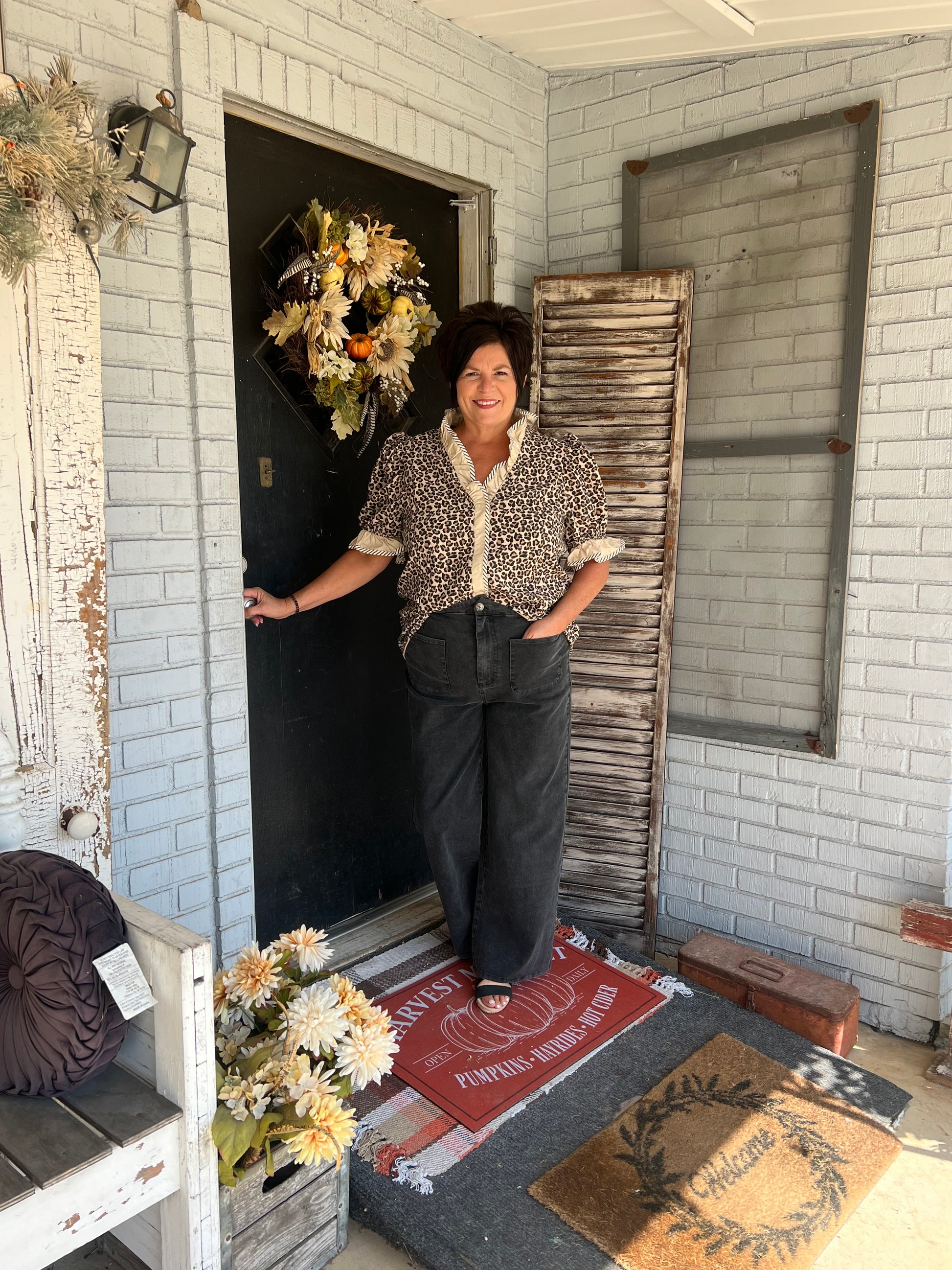 Short sleeved top, Leopard print, ruffled neckline and sleeves