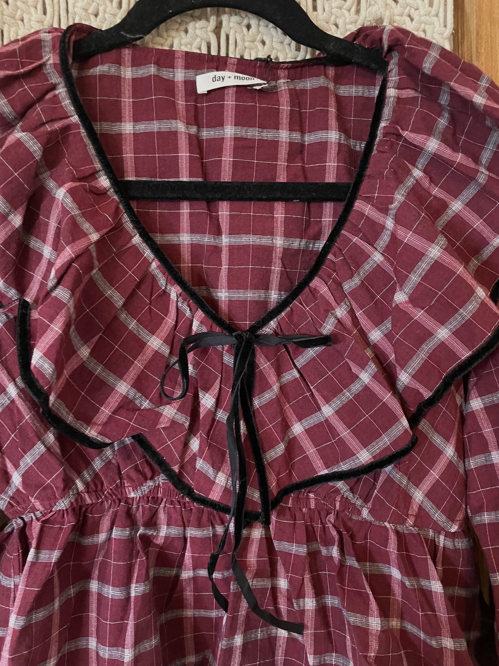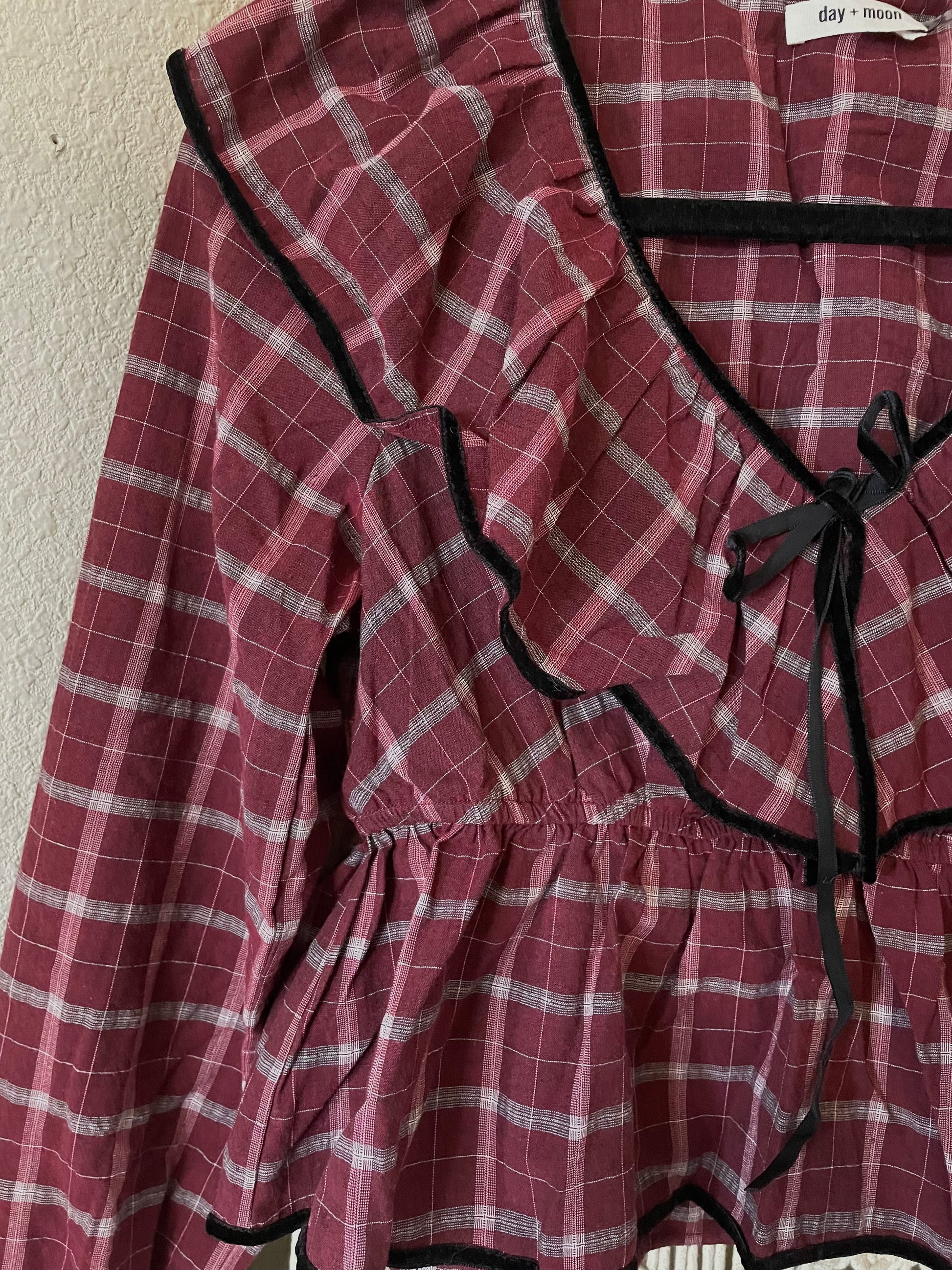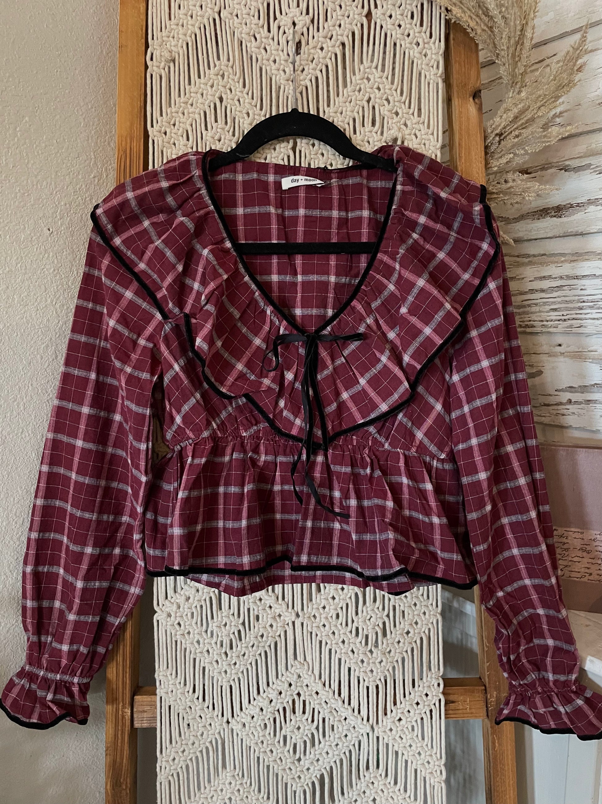 V Neck Collared Long Sleeve Plaid Top With Contrast Velvet Piping