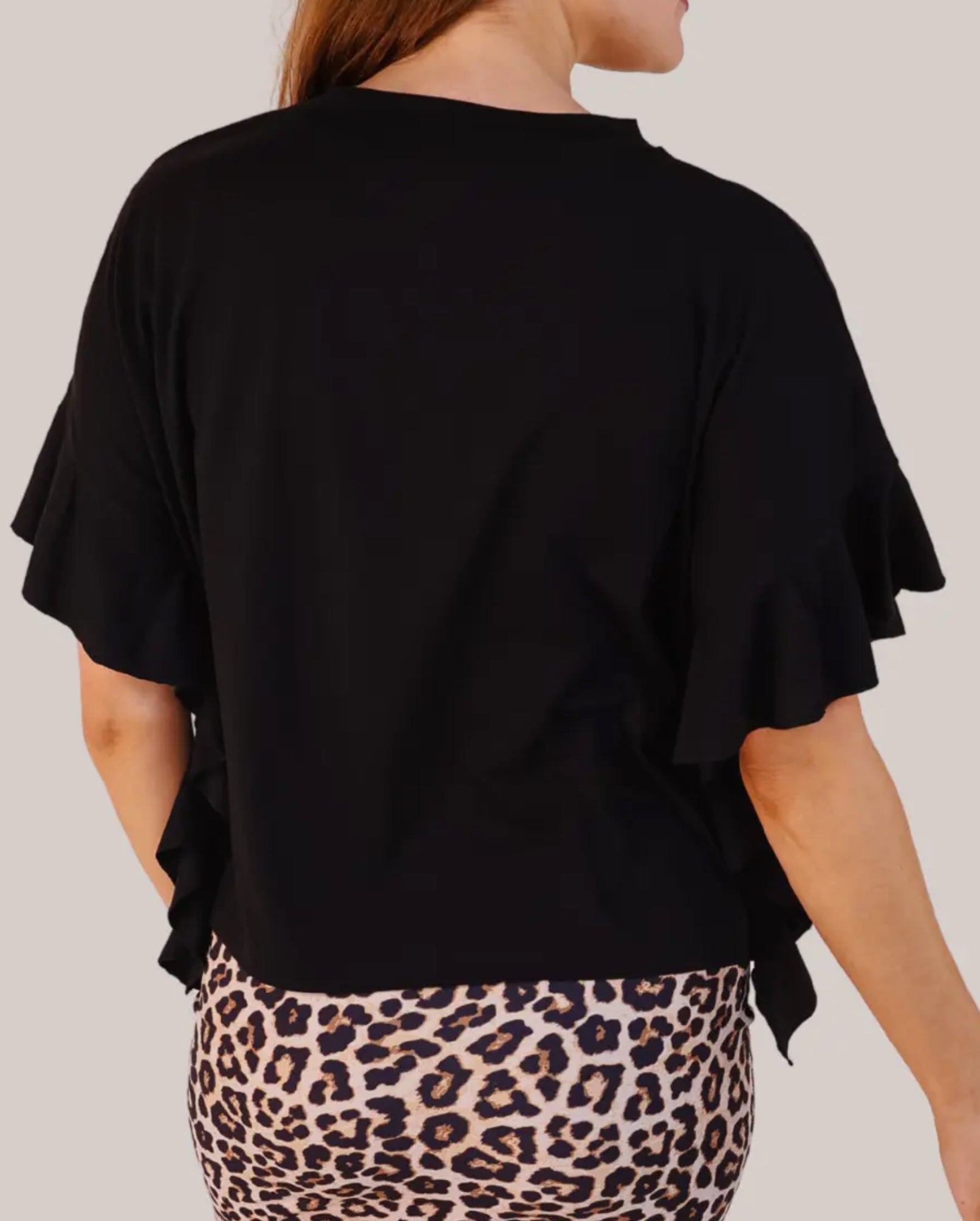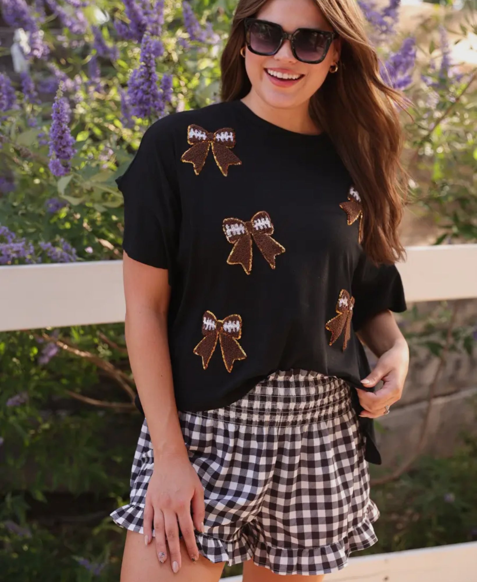 Score big style points with the Sideline Sparkle Ruffle Top. This top features a 'mom crop' length for added trendiness, ruffle sleeves for a touch of femininity, and sewn on chenille football patches outlined in sequins for a subtle sparkle. Made from soft and stretchy material, it's the ultimate game-day fashion statement!