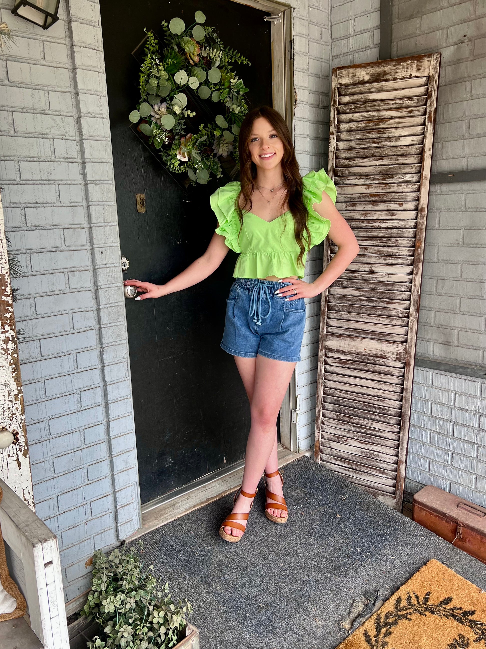 Cropped double ruffle sleeve top with sweetheart neckline.